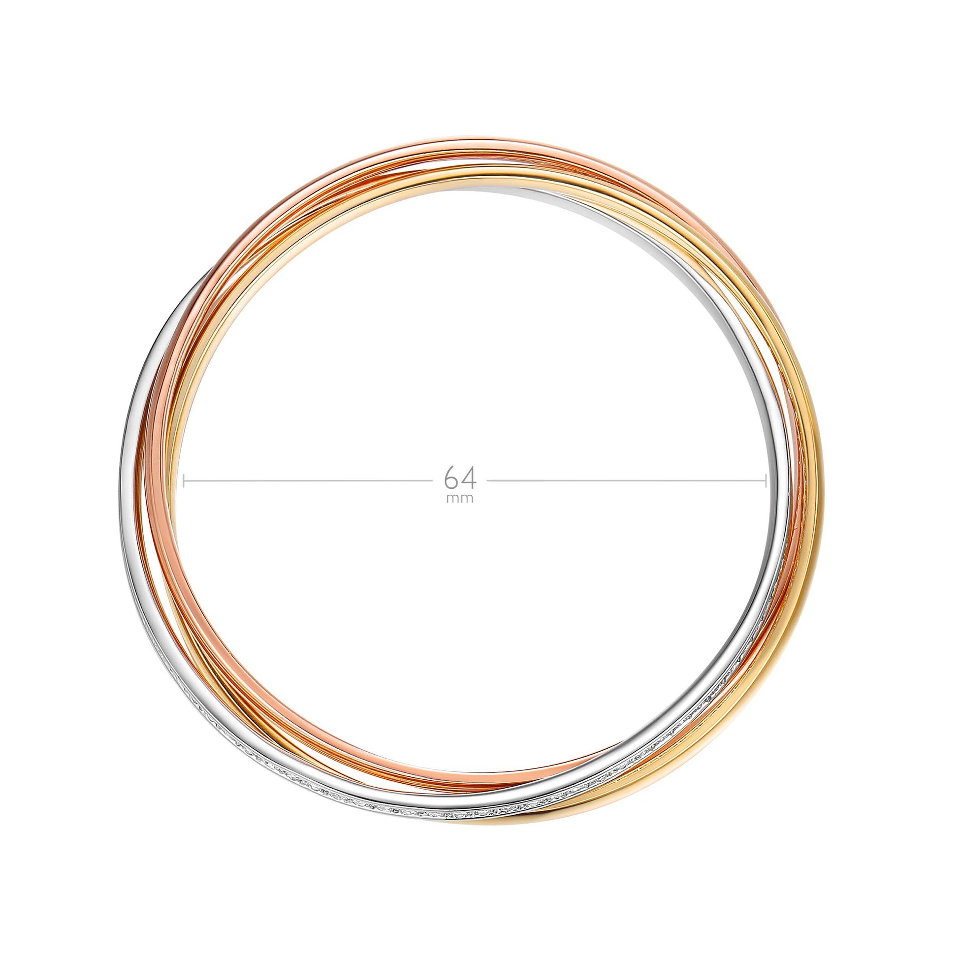 - The trinity interlocking bangles combines the classic gold plating with the modern touch of cool rhodium (18k white gold coloured) and a warm, feminine touch of the rose gold, creating a timeless piece that will compliment its wearer on any occasion.